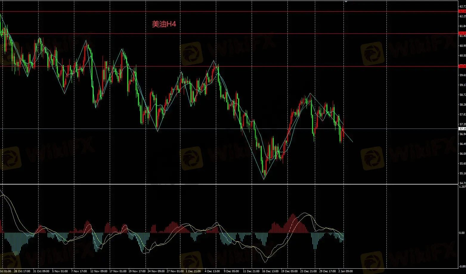 H4图表持续看空,下方支撑位57,日内逢高卖出操作。