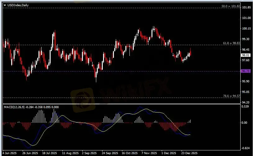 日线图显示美元指数恢复下挫,当前承压于98.80阻力。从MACD来看,快慢线拐向上行,白色动能柱温和放量。指数走势和动能柱的变化呈分歧。