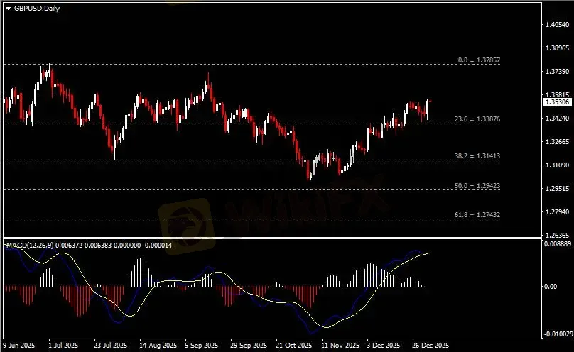 日线图显示英镑兑美元震荡上涨,当前企稳于1.3390支撑。从MACD来看,快慢线欲形成死叉,白色动能柱收缩殆尽。汇价走势和动能柱的变化呈分歧。