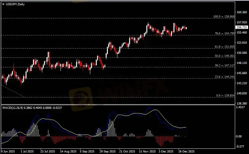 日线图显示美元兑日元于高位区间震荡,当前仍收于154.80支撑。从MACD来看,快慢线呈平行,红色动能柱则显示汇价动能有限。汇价走势基本和动能柱的变化一致。