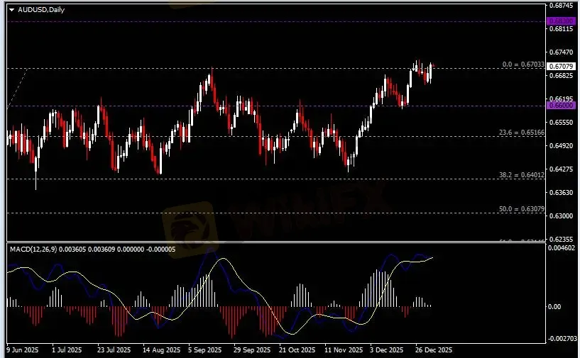 日线图显示澳元兑美元反弹上涨,当前测试0.67关键阻力。从MACD来看,快慢线欲形成死叉,白色动能柱温和收缩。汇价走势和动能柱的变化呈分歧。