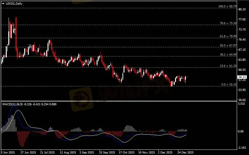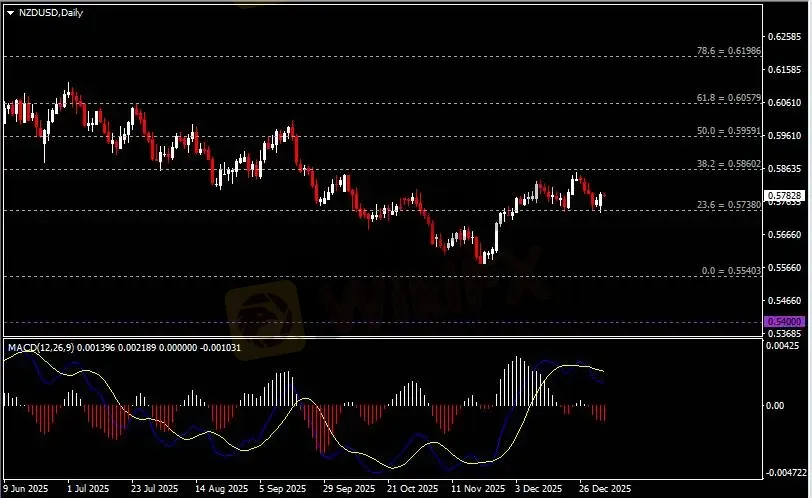 日线图显示纽元兑美元企稳收涨于0.5740支撑。从MACD来看,快慢线向下扩张,红色动能柱温和放量。汇价走势和动能柱的变化呈分歧。