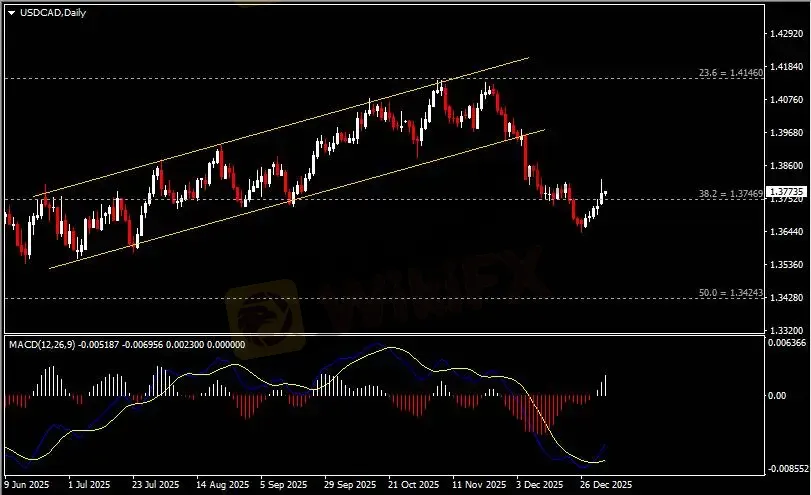 日线图显示美元兑加元反弹上行,当前收于前高1.3750。从MACD来看,快慢线拐向上行,白色动能柱温和放量。汇价走势基本和动能柱的变化一致。