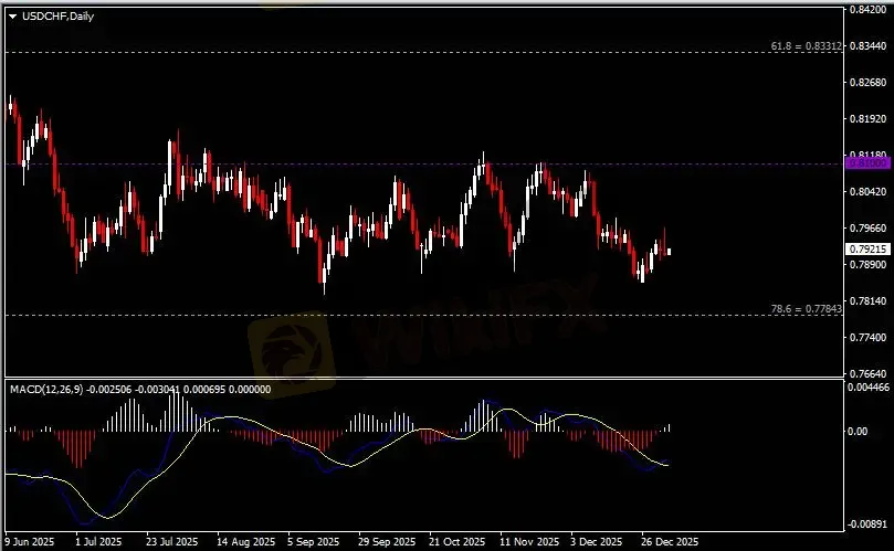 日线图显示美元兑瑞郎先涨后跌,当前承压于0.81关键阻力。从MACD来看,快慢线金叉依旧,白色动能柱温和增量。汇价走势和动能柱的变化呈分歧。