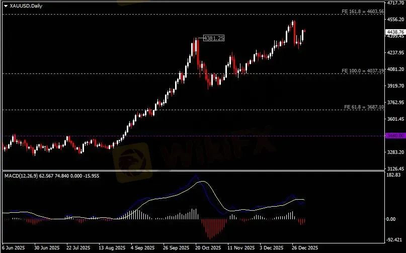 日线图显示金价强势反弹,当前仍承压于4600关键阻力。从MACD来看,快慢线呈拐向,红色动能柱温和收缩。金价走势基本和动能柱的变化一致。