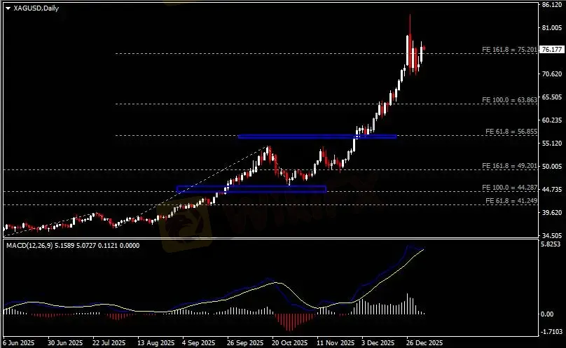 日线图显示银价震荡走强,当前收于前高75。从MACD来看,快慢线欲形成死叉,白色动能柱温和收缩。银价走势和动能柱的变化呈分歧。