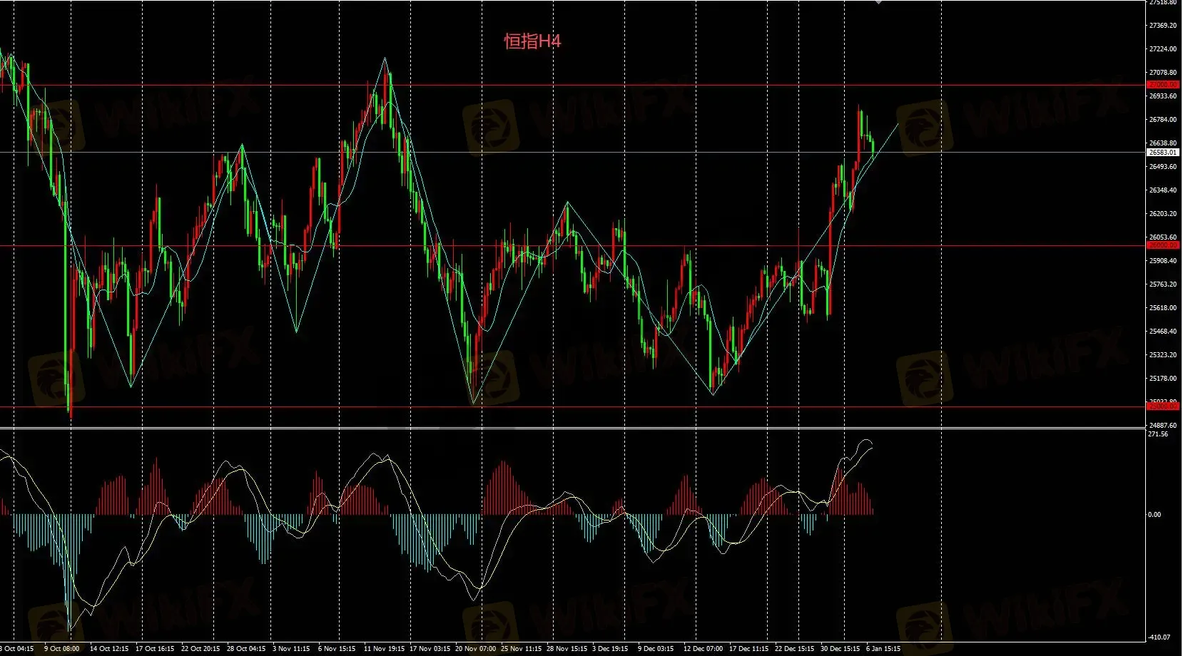 恒指H4当前看空,只要价格维持在26000上方持续看多,对若日内或有回调但不影响近期持续看多思路;目标27000。