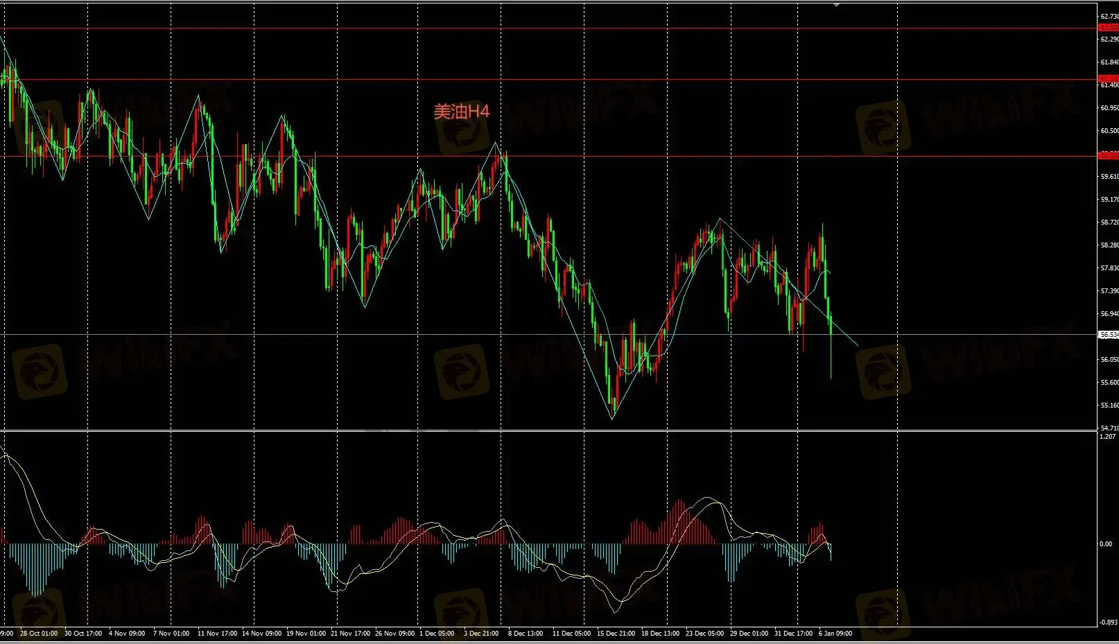 H4图表持续看空,下方支撑位57,日内逢高卖出操作。