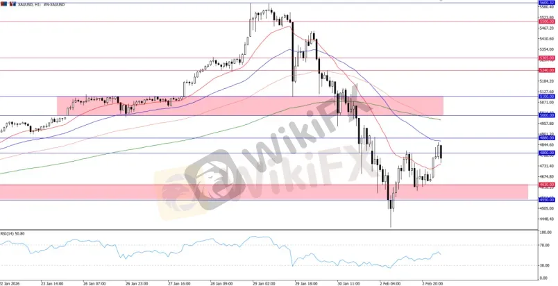 黄金在经历了从 $5,600 附近峰值的历史性崩盘后,目前正处于脆弱的“疗伤”阶段。在经历了击穿 $4,500 的剧烈抛售后,金价出现了疲弱的技术性修复,目前回升至 $4,800 附近。