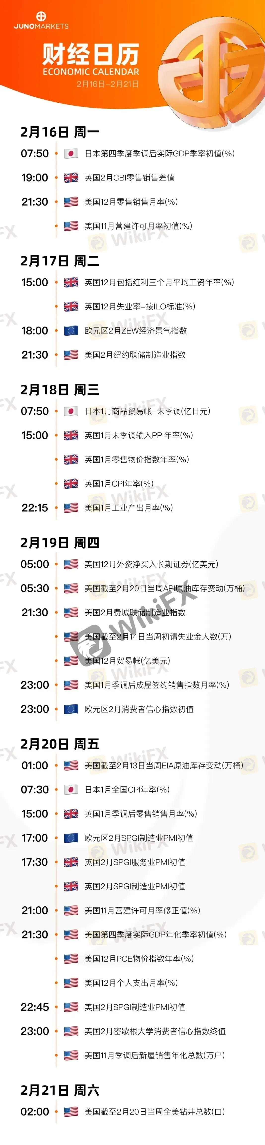 JUNO MARKETS丨财经日历 (2.16-2.21)