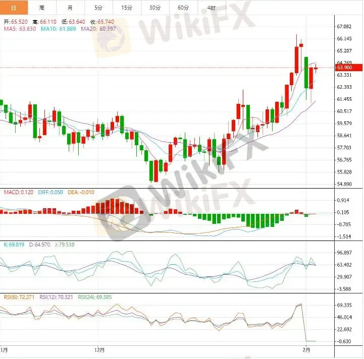 从日线结构来看,WTI 原油在前一交易日大幅下挫后,于 61 美元附近获得明显支撑,并在周二形成较为典型的反弹走势。价格重新站上 63 美元整数关口,表明低位买盘开始介入,短期抛压得到阶段性释放。均线系统显示,WTI 当前运行在短期与中期均线的交汇区域。9 日均线在快速回落后趋于走平,反映短线动能由单边下行转向震荡整理;50 日均线位于 62 美元附近,成为当前价格下方的重要技术支撑。