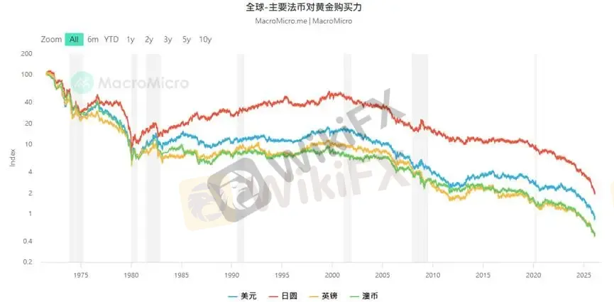 当前市场对于黄金能够持续上涨的共识在于「法币贬值」,法币的购买力遭到稀释,这是黄金长期上涨动能的基石。