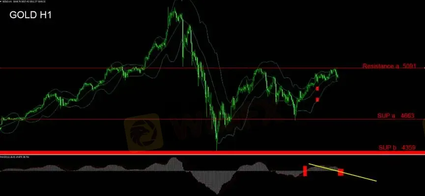 亚盘时段遇阻前高水平压力5091,价格打回收阴线,可介入短空单操作。上破5091则表示上行动能延续,止损后可反向做多。