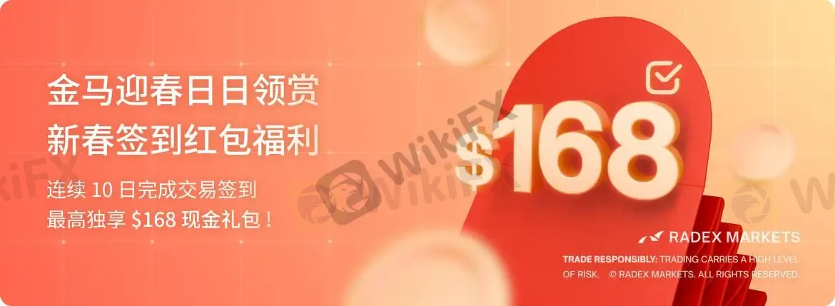 国际监管的外汇和 CFD 经纪商 RADEX MARKETS 瑞德克斯,宣布为亚太市场客户推出新春签到红包专属福利活动,活动时间为 2026 年 2 月 16 日至 2 月 28 日。 本次活动以每日现金奖励回馈交易者。客户在每个交易日完成 1 标准手有效交易,即可获得当日 USD $10 新年红包奖励。若连续 10 日完成交易签到,将额外获得 USD $68 全勤红包,累计最高独享 USD $168 现金礼包。