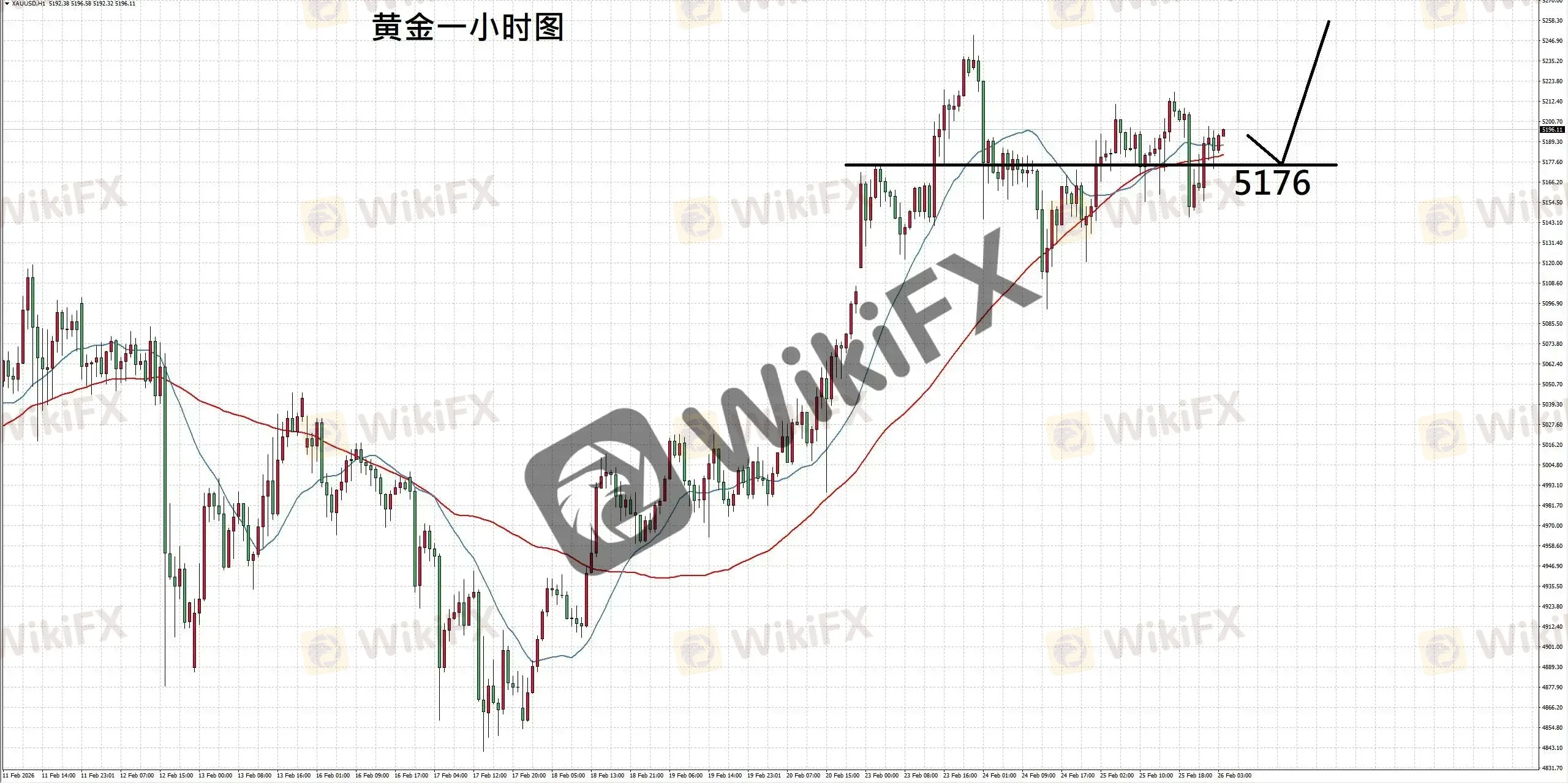黄金一小时图,走势震荡后向上突破,并刷新短线高点,显示买盘较强;如后续回落未击破前期支撑,则走势或继续向上。