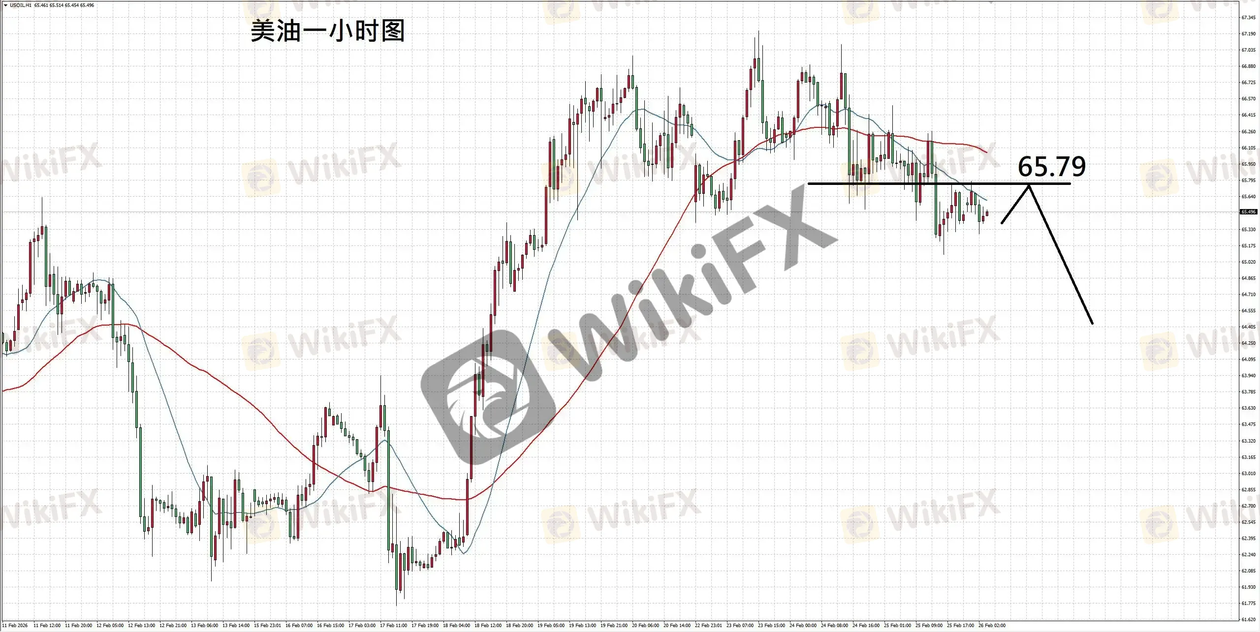 美油一小时图,走势回升未能越过压力,并向下回吐涨幅,配合均线开始下弯,显示卖压增强;如反弹未能突破前期阻力,则走势或向下修正。