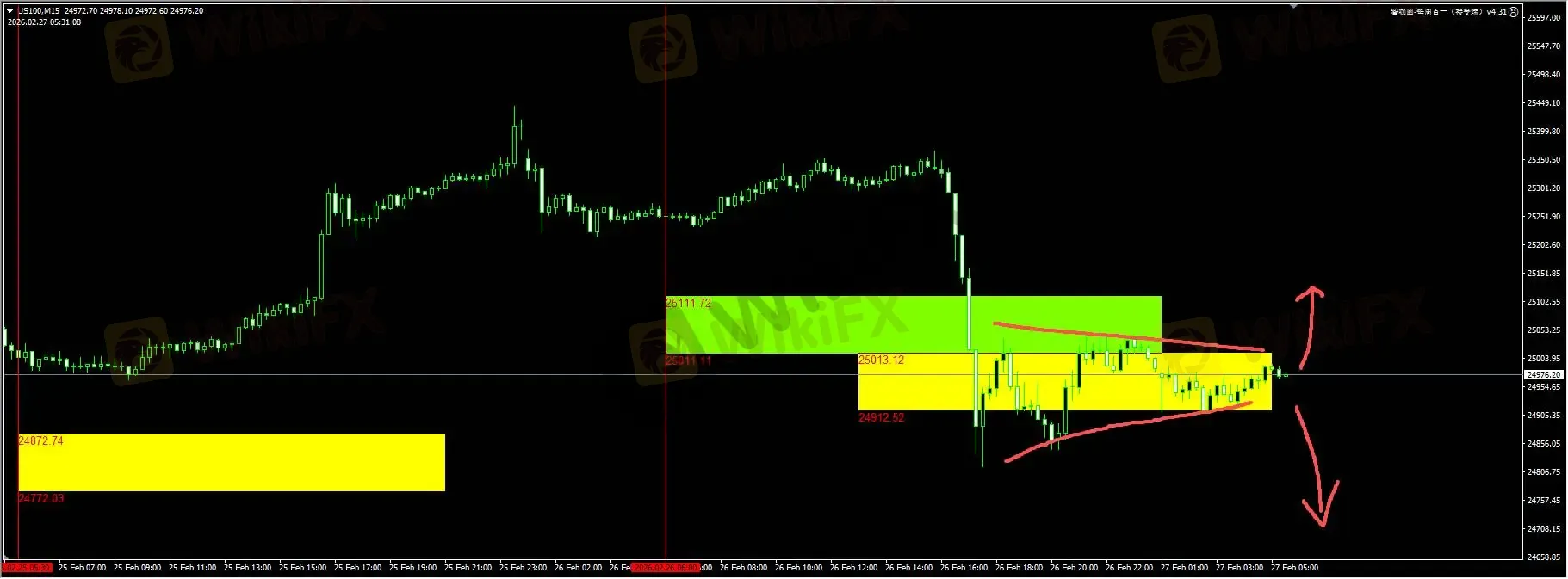 纳指:虽然英伟达财报强劲,但股价却再度遭遇抛售,拖累纳指下跌约2%。目前价格跌至24900一线,进行收敛盘整,日内关注短期突破的方向选择。详细位置请咨询插件。