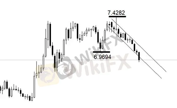 行情方面,月线级别,美元兑离岸人民币处于图中下降通道之内。月线级别的中期低点在6.9694,月线级别的中期高点在7.4282。当前的下跌波段正在寻找新的中期低点。关键支撑位6.9694已经被跌破。下方没有明显的技术性支撑,预计跌势还将延续数月。