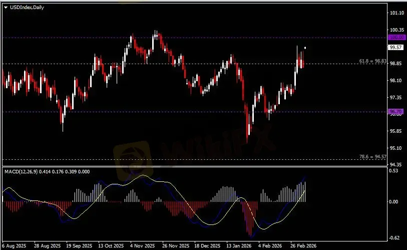 日线图显示美元指数于高位震荡,当前收于98.80支撑。从MACD来看,快慢线向上运行,白色动能柱温和放量。指数走势基本和动能柱的变化一致。