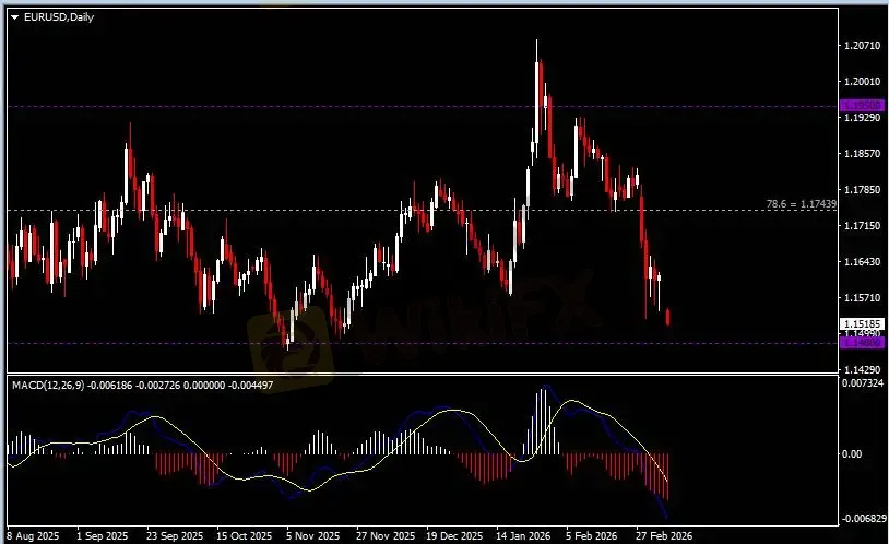 日线图显示欧元兑美元低开走弱,当前承压于1.1740阻力。从MACD来看,快慢线向下运行,红色动能柱温和放量。汇价走势基本和动能柱的变化一致。