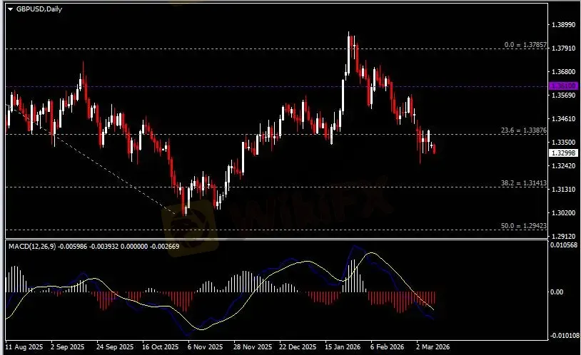 日线图显示英镑兑美元于低位区间震荡,当前仍承压于1.3390阻力。从MACD来看,快慢线向下运行,红色动能柱则温和收缩。汇价走势基本和动能柱的变化一致。