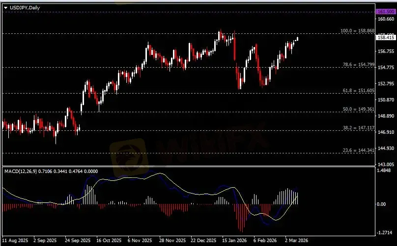 日线图显示美元兑日元震荡上行,当前仍承压于158.90阻力。从MACD来看,快慢线向上运行,白色动能柱则呈平行。汇价走势和动能柱的变化呈分歧。