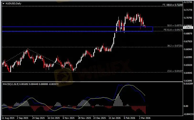 日线图显示澳元兑美元回调走弱,当前测试0.6920-0.6970支撑区域。从MACD来看,快慢线向下运行,红色动能柱温和放量。汇价走势基本和动能柱的变化一致。