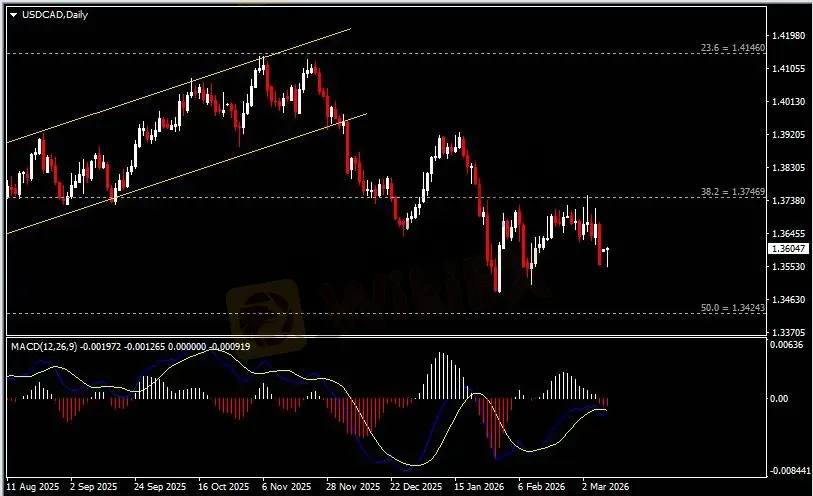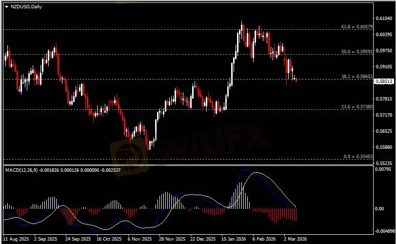 日线图显示纽元兑美元回调下挫,当前测试0.5870支撑。从MACD来看,快慢线向下运行,红色动能柱温和放量。汇价走势基本和动能柱的变化一致。