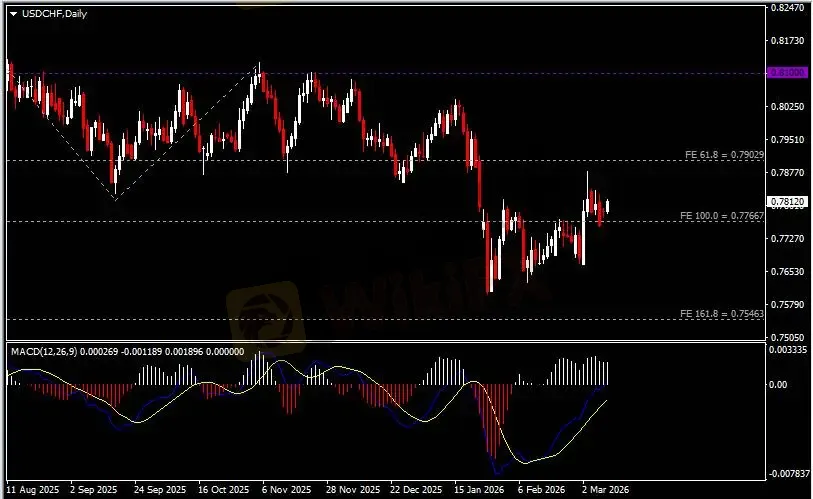 日线图显示美元兑瑞郎波幅有限,当前仍收于0.7770支撑。从MACD来看,快慢线向上运行,白色动能柱呈平行。汇价走势基本和动能柱的变化一致。