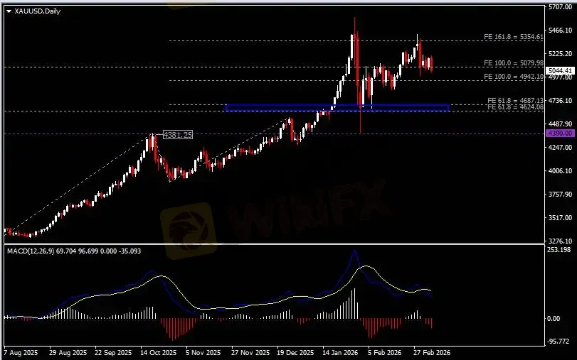 日线图显示金价温和收涨于5080支撑。从MACD来看,快慢线拐向下行,红色动能柱温和放量。金价走势和动能柱的变化呈分歧。