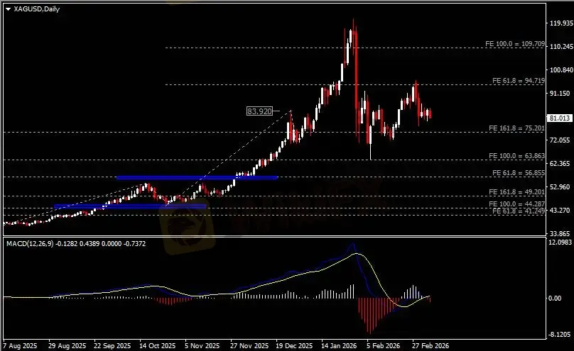 日线图显示银价跌势暂缓,当前仍收于75.20支撑。从MACD来看,快慢线死叉依旧,红色动能柱温和增量。银价走势和动能柱的变化呈分歧。