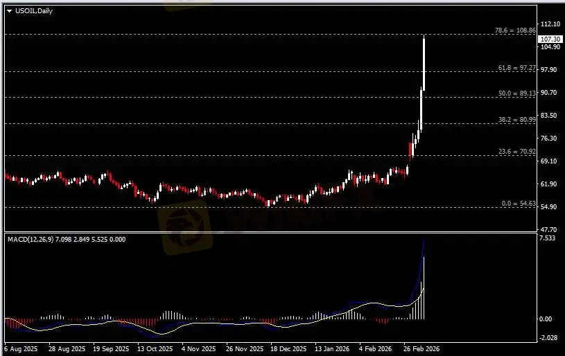 日线图显示油价强势冲高,当前逼近109阻力。从MACD来看,快慢线向上扩张,白色动能柱持续放量。油价走势基本和动能柱的变化一致。