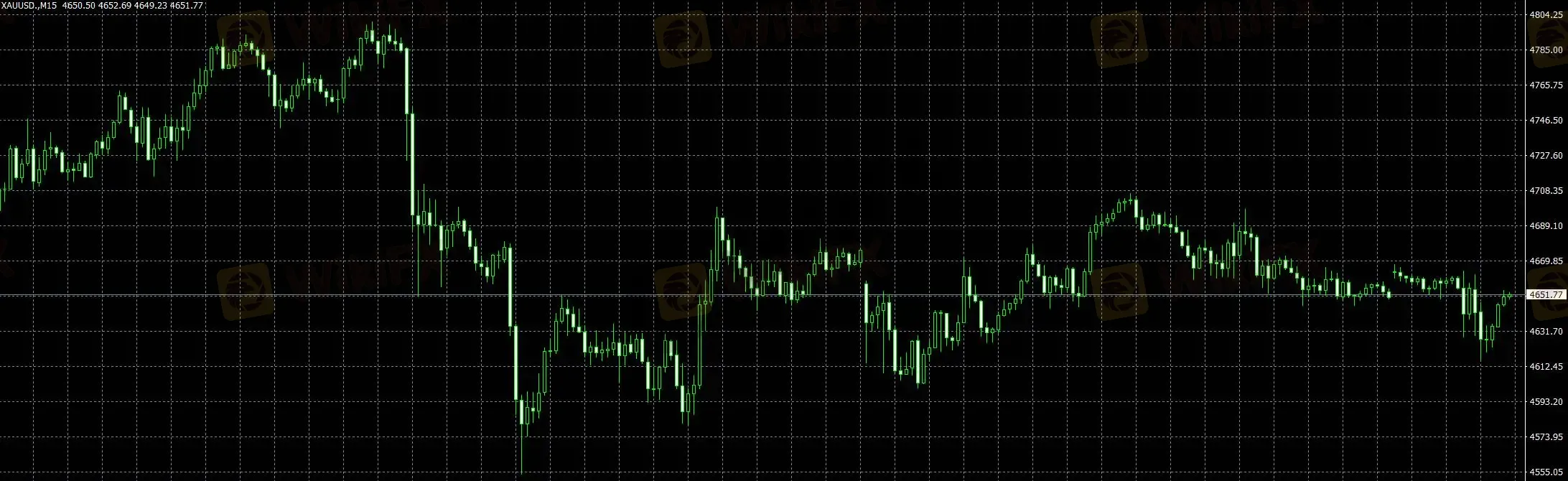 15分钟级别下,黄金表现为典型的冲高回落后横盘震荡结构。此前快速上冲后出现明显回吐,随后进入反复拉锯阶段,说明短线资金在高位分歧加大。