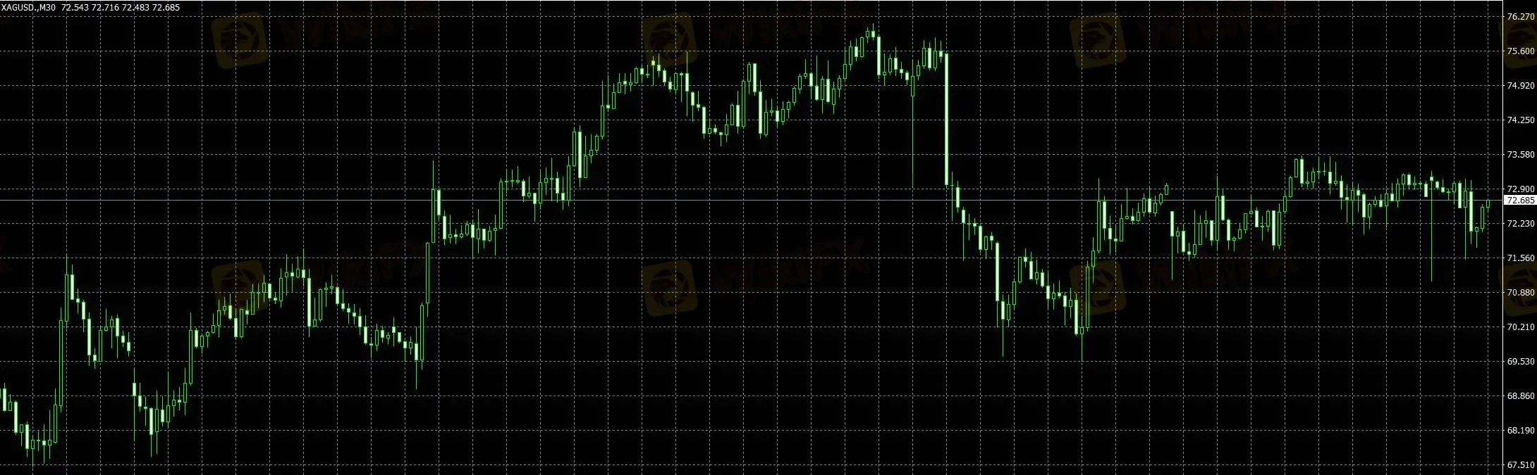 30分钟级别中,白银此前震荡上行结构较为清晰,但在高位区域出现一次明显下压,直接将价格打回区间中部,说明上方压力转化为实际抛售。