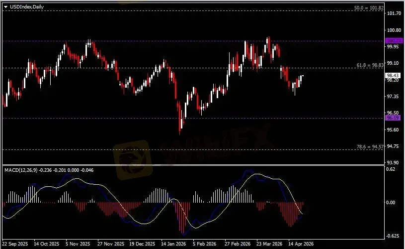 日线图显示美元指数反弹上行,当前仍承压于98.80阻力。从MACD来看,快慢线呈拐向,红色动能柱温和收缩。指数走势基本和动能柱的变化一致。