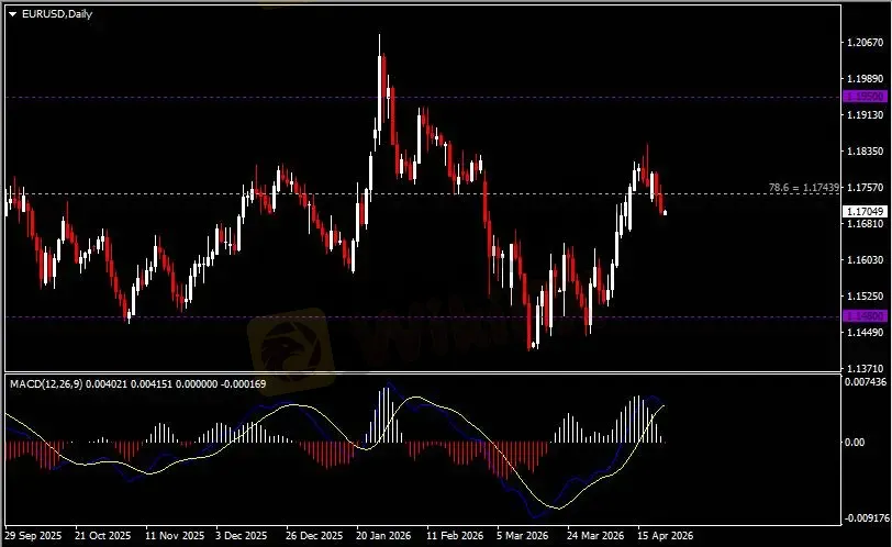 日线图显示欧元兑美元回调下跌,当前收于前低1.1740。从MACD来看,快慢线形成死叉,白色动能柱收缩殆尽。汇价走势基本和动能柱的变化一致。