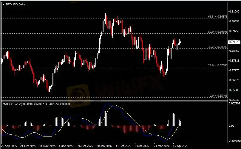 日线图显示纽元兑美元震荡上行,当前收于0.5860支撑。从MACD来看,快慢线向上运行,白色动能柱则温和收缩。汇价走势和动能柱的变化呈分歧。