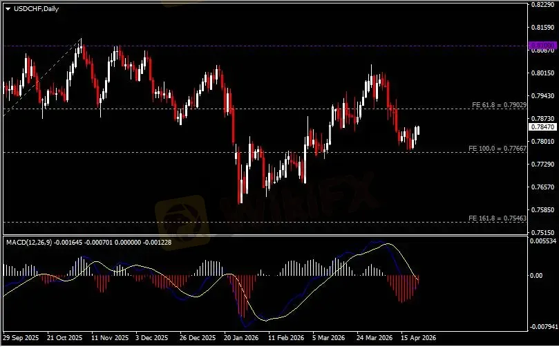 日线图显示美元兑瑞郎反弹上涨,当前收于0.7770支撑。从MACD来看,快慢线呈拐向,红色动能柱温和收缩。汇价走势基本和动能柱的变化一致。