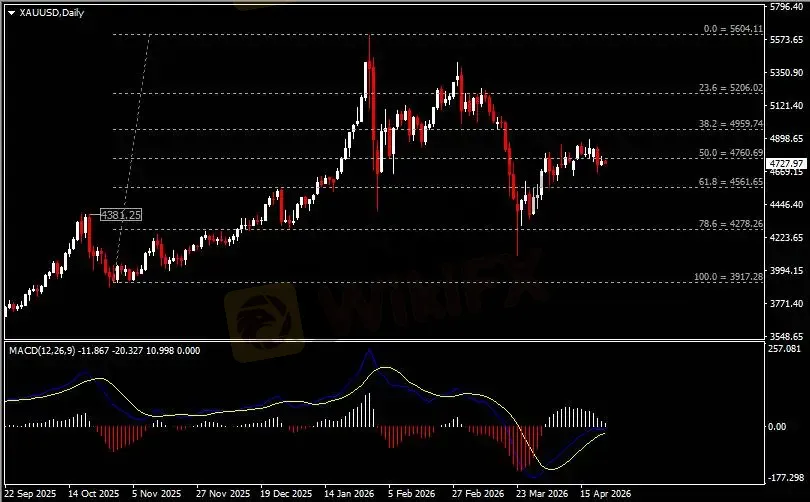 日线图显示金价回调暂缓,当前仍承压于4760阻力。从MACD来看,快慢线逐渐收窄,白色动能柱温和收缩。金价走势和动能柱的变化呈分歧。