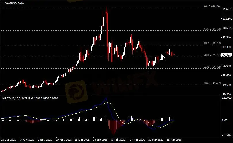 日线图显示银价小幅收涨于75.50支撑。从MACD来看,快慢线呈拐向,白色动能柱温和收缩。银价走势和动能柱的变化呈分歧。