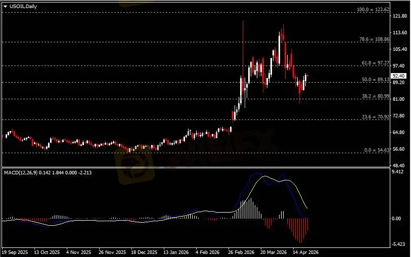 日线图显示油价反弹上行,当前收于前高89。从MACD来看,快慢线呈拐向,红色动能柱温和收缩。油价走势基本和动能柱的变化一致。