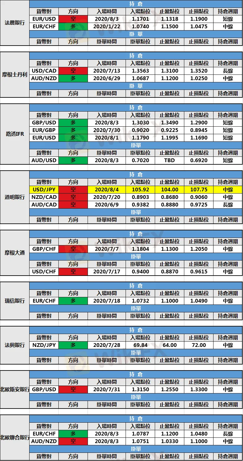 (1)道明銀行新增美元/日元空頭持倉,入場點位105.92,止盈點位104.00,止損點位107.75。