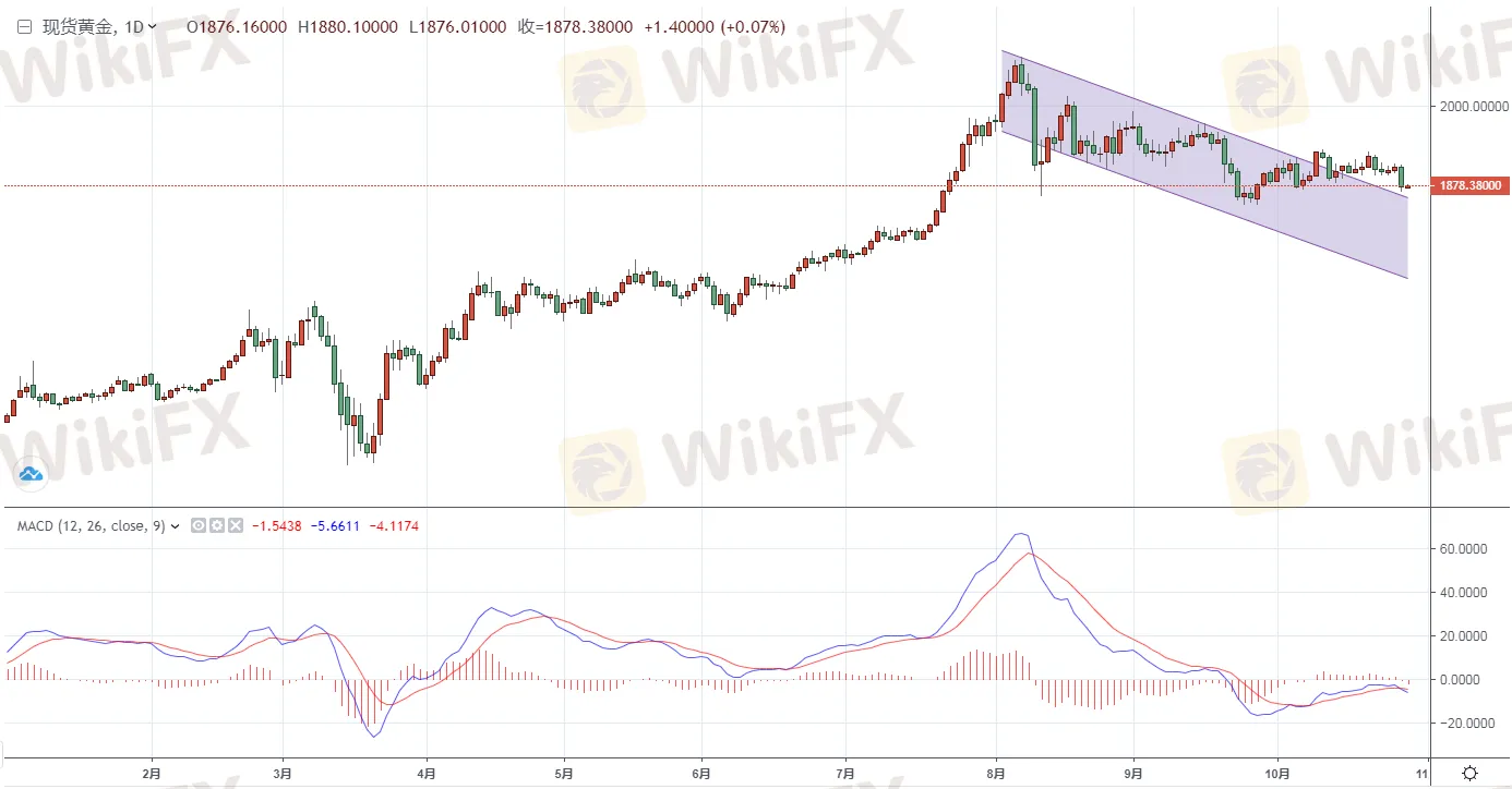 現貨黃金昨日收報1876.83美元/盎司,下跌30.66美元或1.61%,盤中最高觸及1910.77美元/盎司,最低觸及1869.23美元/盎司。今天現貨黃金雖然有小幅反彈,但是仍然位於1880關口下方,暫報1878.54美元/盎司。從近期的表現看,金價整體呈現出高位回落的格局,從趨勢看,金價反彈高點不斷被壓低,由於市場對於目前已知的風險已經麻木,致使黃金連續承壓回落。而伴隨著市場對於美國新一輪刺 激方案計畫的希望渺茫,資金紛紛湧入美元,黃金遭受重挫,徹底失守1880關口,下方MACD指標出現技術性死叉,空頭短線占優。(僅供參考)