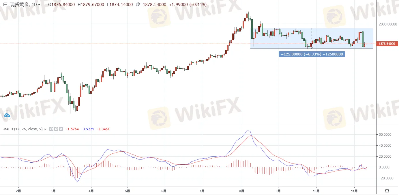 現貨黃金昨天報收1877.11美元/盎司,上漲14.95美元或0.80%,盤中最高觸及1890.29美元/盎司,最低觸及1860.15美元/盎司。今天現貨黃金延續昨日的回升之勢,再度上逼1880關口,暫報1879.03美元/盎司。從近期的表現看,金價整體呈現出高位回落的格局,從趨勢看,金價反彈高點不斷被壓低,由於市場對於目前已知的風險已經麻木,致使黃金連續承壓回落。隨著美國大選的結果的基本落地,隔夜美國藥廠輝瑞及德國生物技術公司BioNTech合作研發的核酸RNA疫苗在大規模試驗中阻止了90%的感染,市場風險情緒一度大受鼓舞,黃金在週一一瀉千里一度下逼1850關口,但是充分消化此利空後,資金轉而期待更大刺 激措施提振經濟復蘇這一點上,致使金價超跌反彈,但是下方的MACD指標顯示做空動能在逐步增強,但目前金價仍位於1850-1975區間震盪,投資者短線需要關注箱體下方的下沿線支撐力度。(僅供參考)