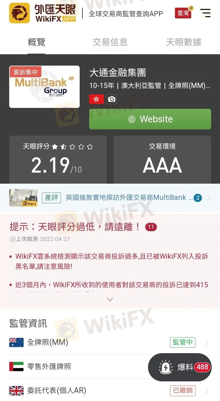 大通金融的天眼評分僅2.19分,儘管宣稱有許多監管牌照,但多數都是屬於異常狀態,存在巨大風險,建議投資者們立即遠離!