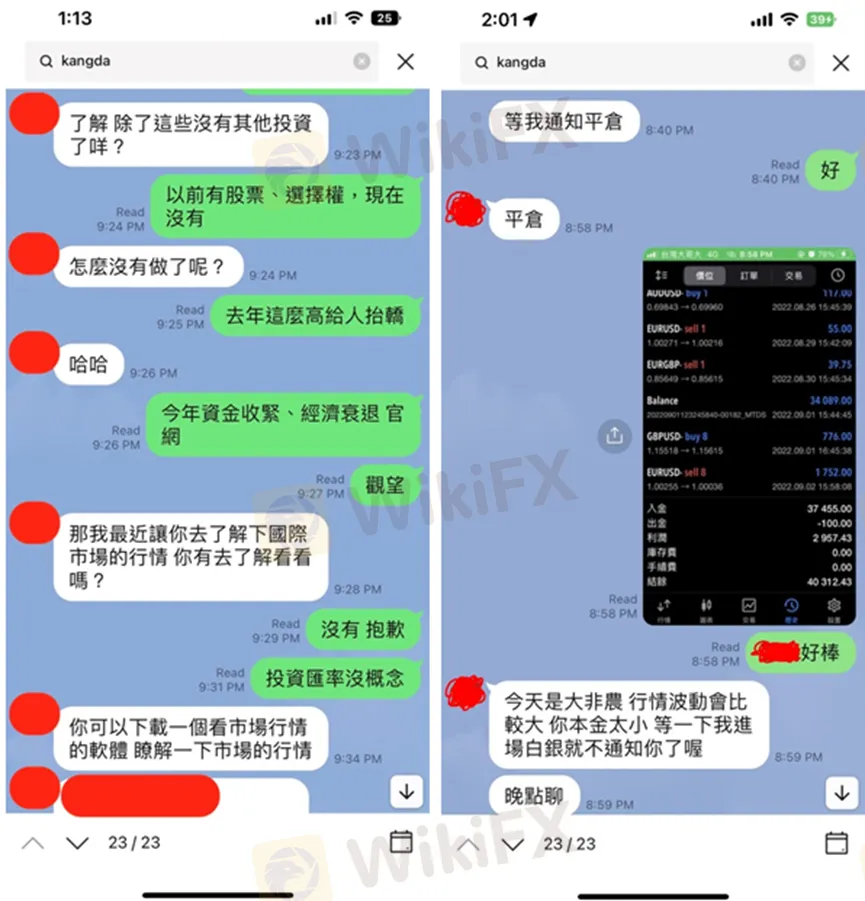 最近,一位投資人向外匯天眼爆料,他之前透過交友軟體認識一位女網友,雙方互動相當不錯,於是便交換了LINE。幾天後在一次聊天中,對方突然聊起投資理財的話題,並推薦他使用KangDa這個平台。一開始受害者在對方的指示下,入金1000美元小試身手,結果發現每次跟單進場都能賺20-30美元,並且成功出金100美元。