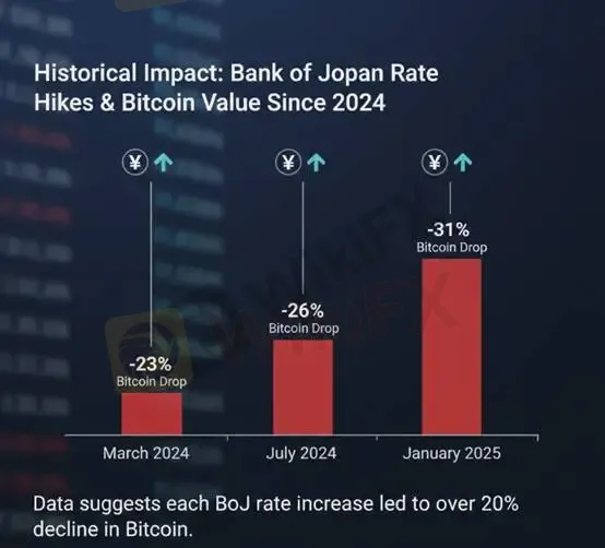 歷史經驗回顧:根據歷史經驗顯示,自2024年以來,每一次日本央行升息都導致比特幣下跌超過20%。如2024年3月、7月、2025年1月,比特幣跌幅分別為23%、26%、31%。