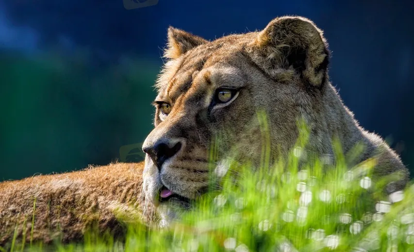 強烈感受到死亡氣息的野牛開始拼命跳動,想掙脫獅子的利齒,並用尖角不斷頂向敵人。一擊奏效後,在獅子身上留下一道傷口的同時也使獅子鬆口,但是轉瞬間獅子就捲土重來,又咬住了野牛,殺氣更甚,也更小心防範著攻擊。直到野牛咽氣,那副尖牙才從獵物脖子上鬆開。