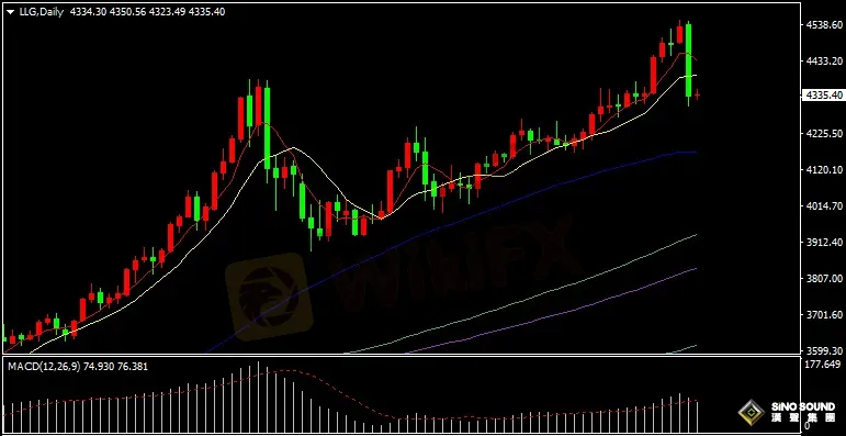 金價日線圖看,昨日金價大幅下跌,最低逼近4300美元關口,表明多頭全線潰退,短線看,金價走勢進入深度調整階段,目前金價已經跌破5日和10日均線下方。日線指標看,5日與10日均線仍然處在多頭排列,但5日均線有所拐頭向下,MACD指標正動能柱有所減少,RSI指標下滑至54位置附近運行。