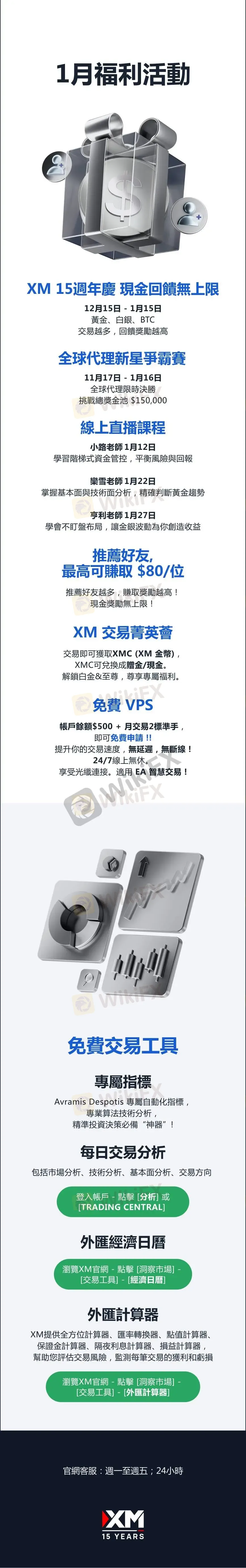 1月 XM 15週年慶活動熱烈進行中!交易黃金、白銀、BTC,3手起享回饋,交易越多獎勵越高。全球代理新星爭霸賽,總獎金池 $150,000,推薦客戶即可贏獎金!線上直播課程帶來全新實戰內容,交易解析、資金管理和不盯盤布局,關鍵重點一次掌握。